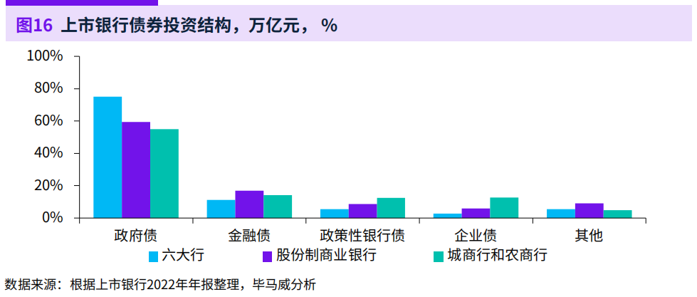 2023年中国银行业调查报告数据,城商行和农商行持有的政府债券占其总债务的比例达58%。六大行和股份制银行这一比例也高,但是人家血厚。
