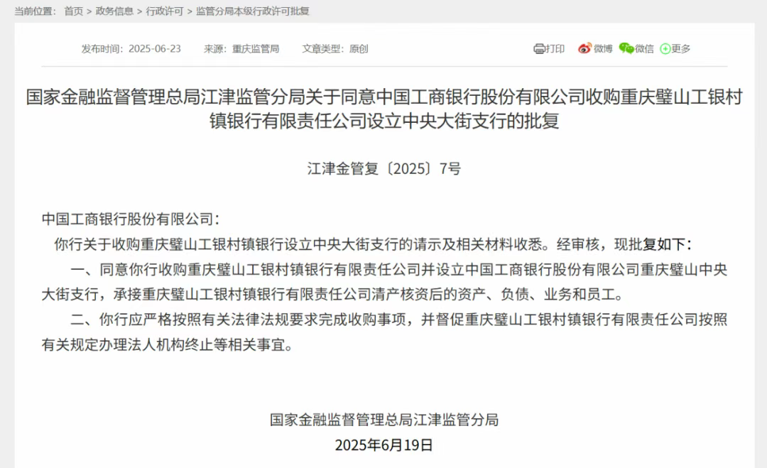 6月23日,国家金融监管总局官网披露的信息,江津监管分局同意中国工商银行收购重庆璧山工银村镇银行,并成立中国工商银行重庆璧山中央大街支行。