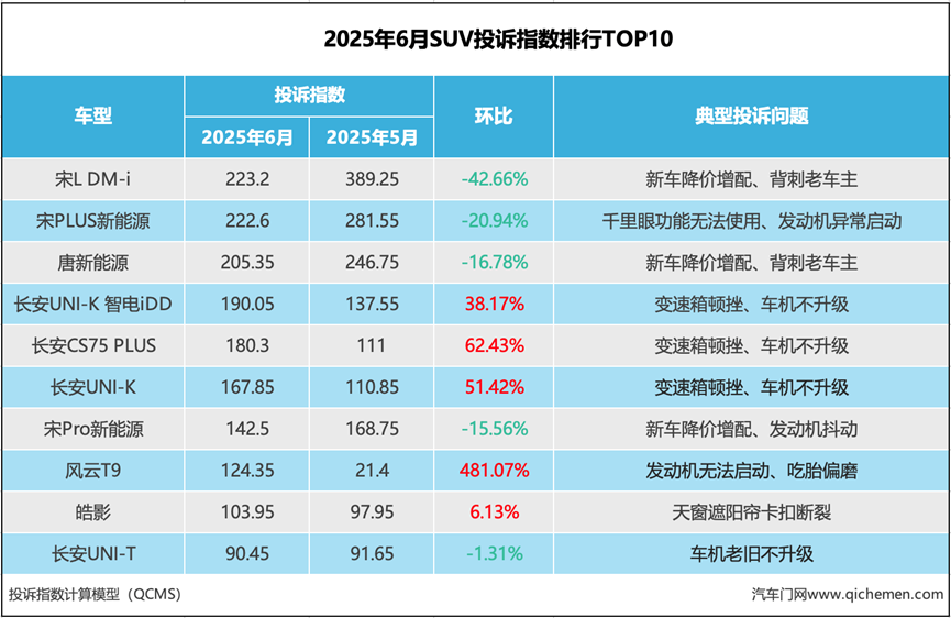 近日,汽车门网公布了2025年6月投诉指数。数据显示,本月SUV的投诉指数为5795.4,环比上升3.08%,相比上月有轻微涨幅。本月投诉榜单TOP10中,比亚迪旗下车型因新车降价增配的问题引发老车主不满,但随着时间流逝,投诉声量有所减弱。长安旗下长安UNI-K 智电iDD、长安CS75 PLUS、长安UNI-K三款车型因变速箱顿挫、车机不升级等问题呈卷土重来之势,投诉指数纷纷上涨。风云T9因发动机无法启动、吃胎偏磨的原因环比暴涨481.07%,空降投诉榜单第九名。
