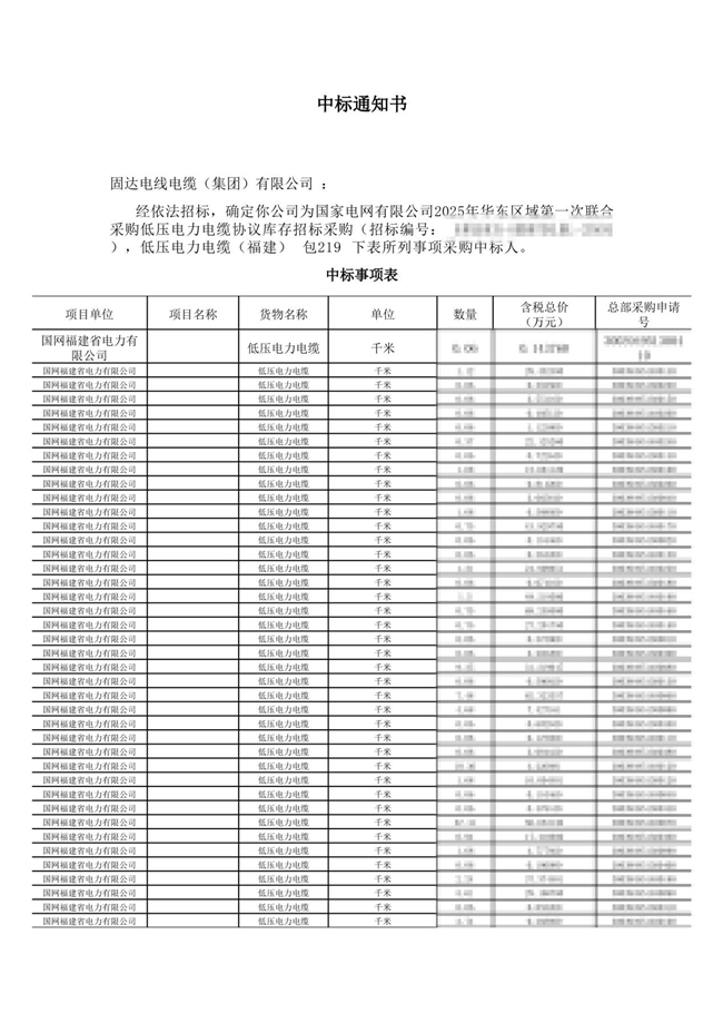 近日,国家电网有限公司2025年华东区域第一次联合采购低压电力电缆协议库存招标采购推荐中标候选人名单公示,固达电线电缆集团成功中标1个标包,产品为低压电力电缆,服务区域涵盖福建等东南沿海地区。