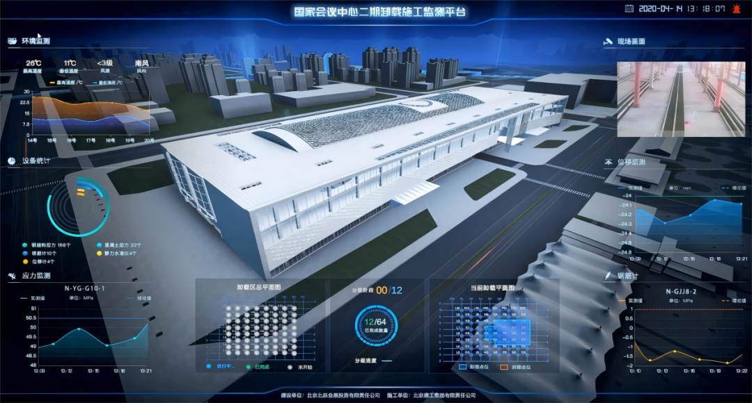 该创新中心研发了大跨度索结构三维可视化动态监测系统,将工程力学、人工智能、计算机、光电传感、IT、BIM、数字孪生等多项学科技术进行有机融合。实现了大跨度索结构施工过程数据采集、传输、存储、分析和反馈的自动化。