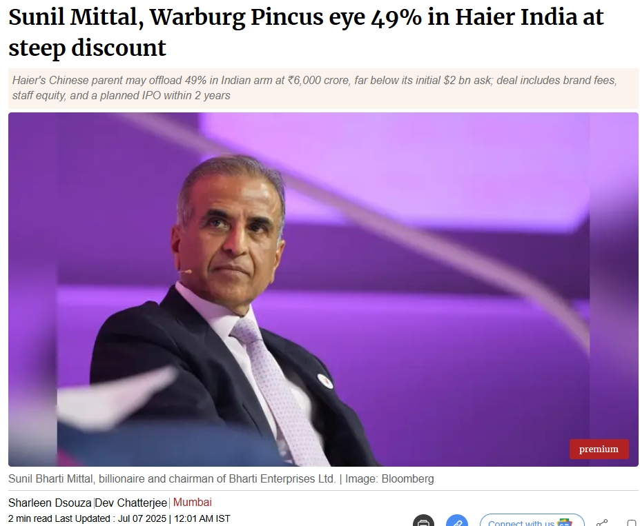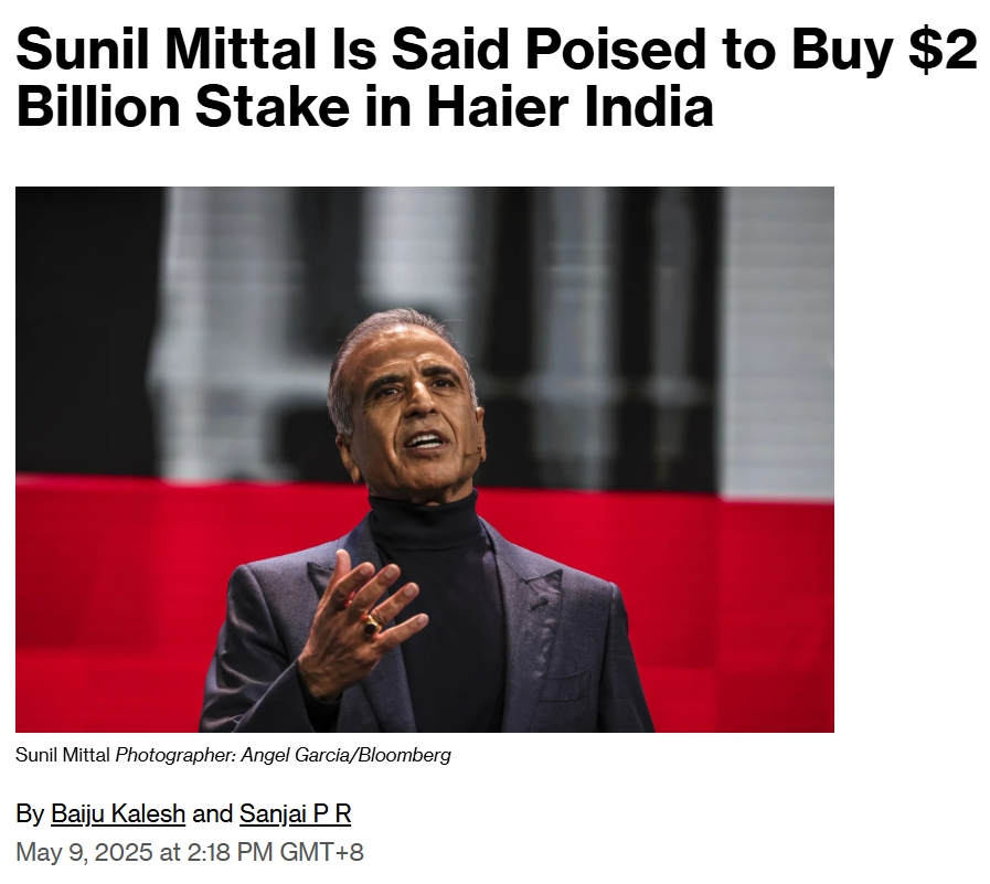 据《商业旗帜报》今天报道,知情人士透露,印度巴帝电信创始人苏尼尔·米塔尔(Sunil Mittal)的家族办公室,正联合美国私募股权公司华平投资,提出以600亿卢比(约合7.2亿美元)收购海尔印度49%的股份。