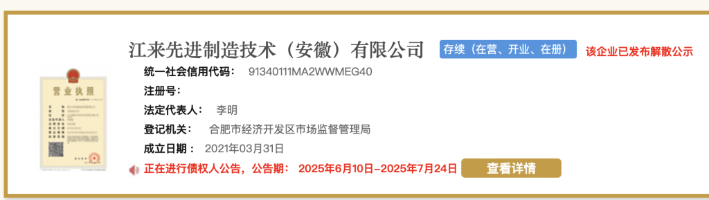 7月7日,据国家企业信用信息公示系统官方网站,江来先进制造技术(安徽)有限公司新增1条注销备案公告,注销原因为“决议解散”,该公司于2021年03月31日正式成立。