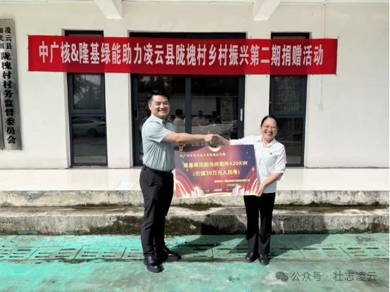 7月3日,中广核新能源公司广西分公司、隆基绿能科技股份有限公司(以下简称“隆基绿能”)到我县陇槐村,开展乡村振兴第二期捐赠活动。县委常委、副县长周芃,隆基绿能战略客户总监王鑫等领导出席活动,共同见证双方深化绿色合作、助力乡村振兴的又一重要时刻。