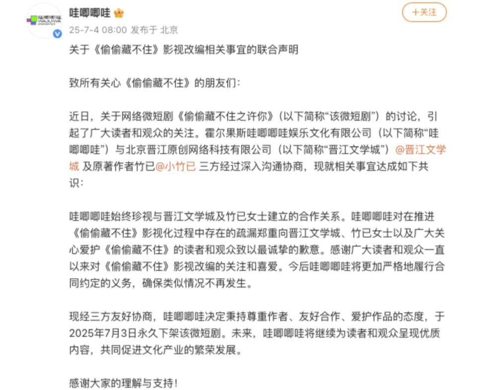 前不久,哇唧唧哇试图通过打“擦边球”的方式将晋江文学城旗下的小说《偷偷藏不住》改编成横屏微短剧,遭到版权方的迎头痛击,最终以哇唧唧哇决定于2025年7月3日永久下架该剧告终,也都说明即便是凡事追求“快”字的短剧行业,对IP的渴求和行业规范的建立其实是并行不悖的。