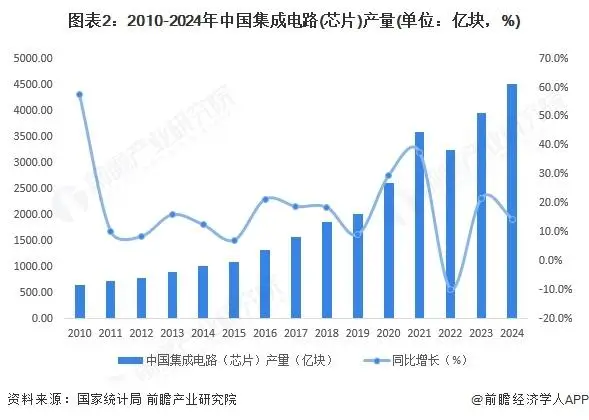 芯片又称集成电路,一般是指集成电路的载体,也是集成电路经过设计、制造、封装、测试后的结果,通常是一个可以立即使用的独立的整体。2010-2024年,中国集成电路(芯片)产量整体呈现波动增长的趋势,增速波动变化。2024年,中国集成电路(芯片)产量为4514.20亿块,同比增长14.4%,生产情况整体稳中向好。