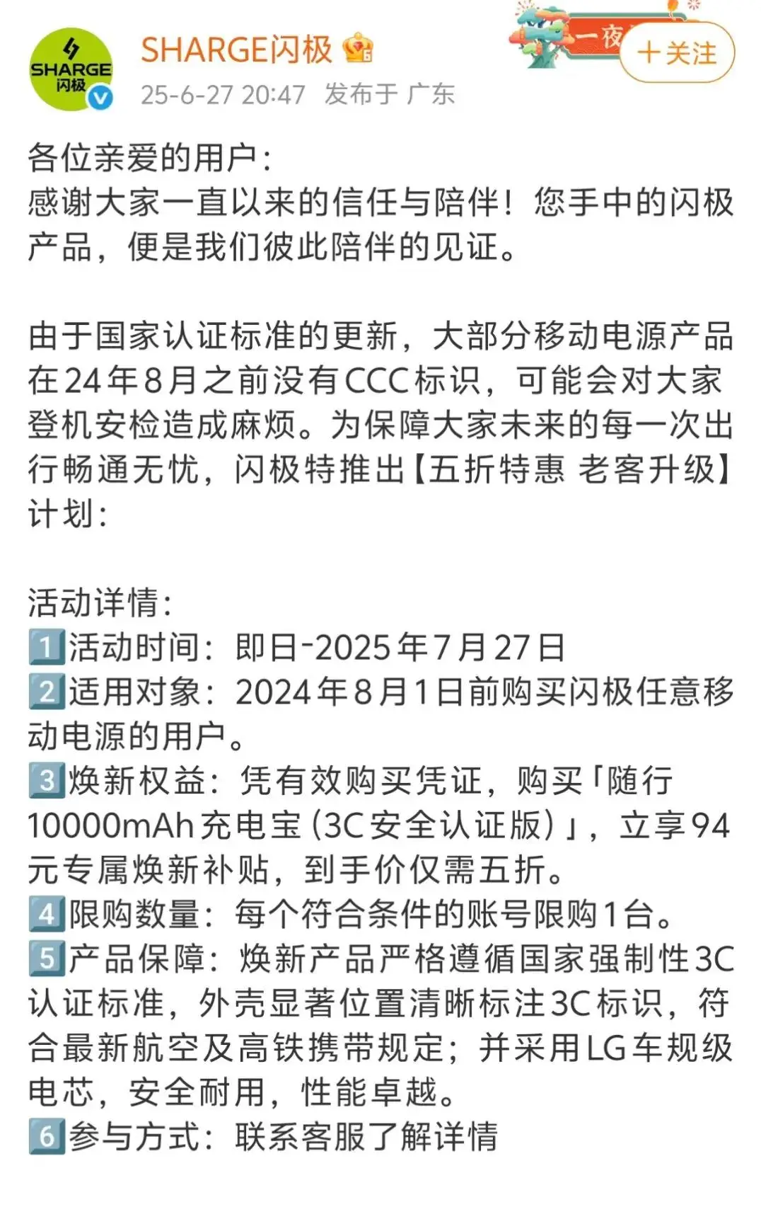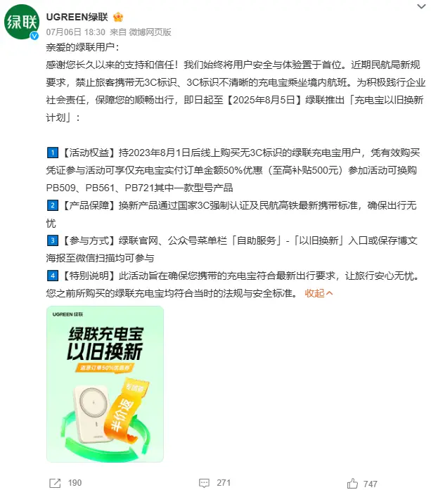 绿联还强调,此活动旨在确保用户携带的充电宝符合最新出行要求,让旅行安心无忧,用户之前所购买的绿联充电宝均符合当时的法规与安全标准。