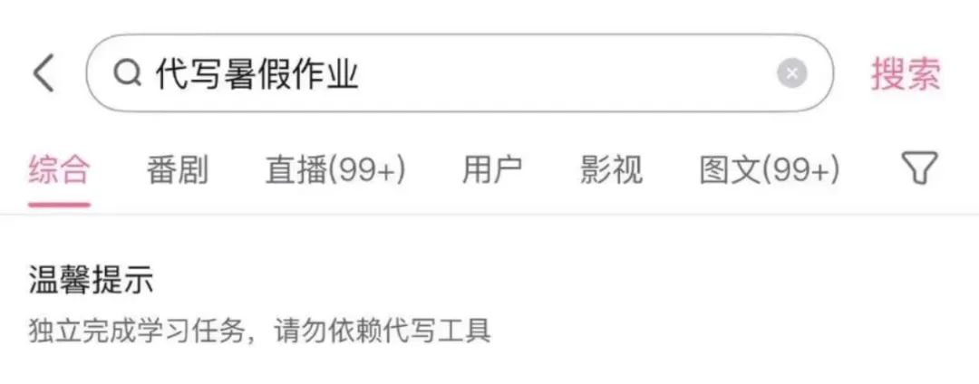 市委网信办立即部署属地未成年人用户数量巨大或者对未成年人群体具有显著影响的网络平台开展全面回查和清理拦截。哔哩哔哩、喜马拉雅等音视频平台强化互动评论区巡查,严防非法外链导流;小红书、SOUL等社交平台严查借机不当营销和诱导充值等违规信息,并畅通投诉举报渠道;拼多多等电商平台严格管控代写作业等各类违规代替类服务,屏蔽“代写暑假作业”等商品搜索结果。哔哩哔哩、小红书等平台在强化管控的同时注重正面引导,当用户搜索“代写作业”等关键词后,主动给出“独立完成学习任务,切勿依赖代写工作”的友善提示。