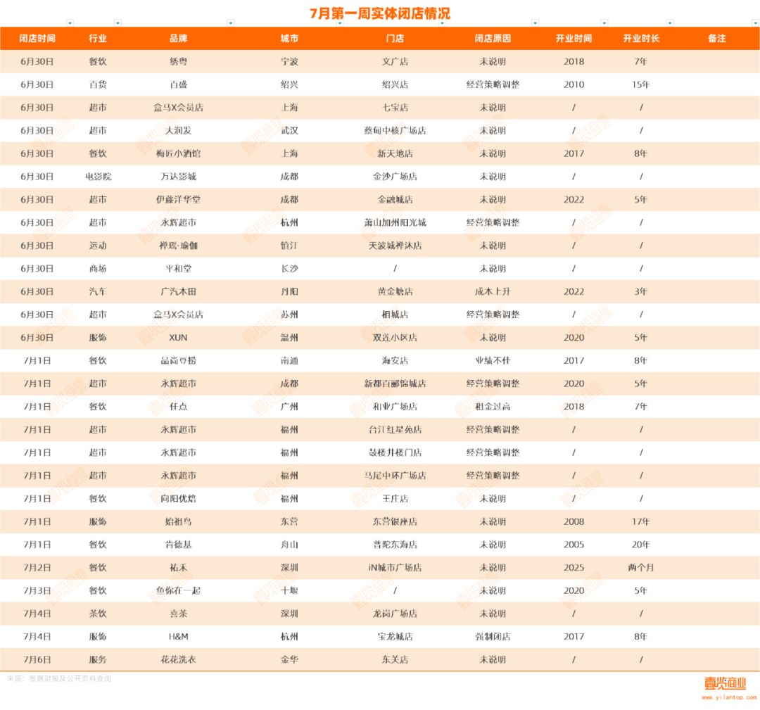 据壹览商业不完全统计,7月第一周,共22个品牌关闭了至少27家门店。