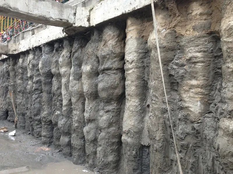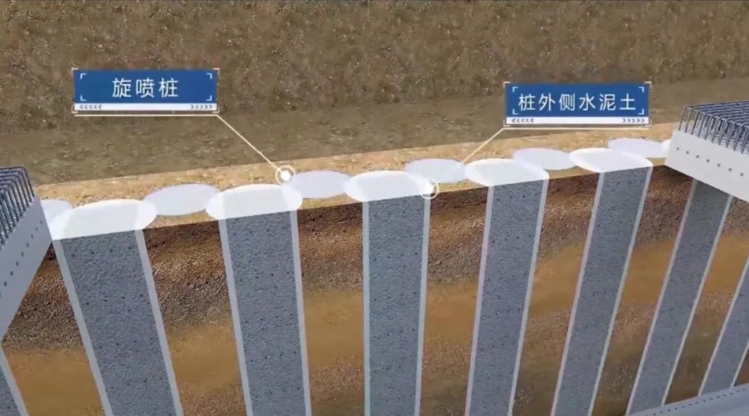 基坑开挖阶段,预制方桩作为基坑围护结构,施工精准,无需破除桩头,桩位合格率100%,桩间采用旋喷桩相咬合形成止水帷幕: