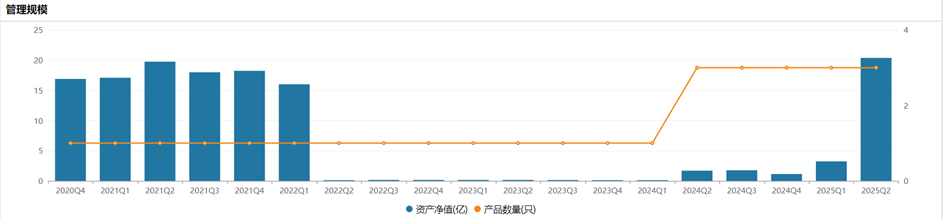 从业绩表现来看,2022年后基金公司收入始终维持在6亿左右的水平,2024年收入大幅下降,净利率水平从24.8%跌至24.2%;公司收入下降主要受其降低管理费率以及低管理费用率的固收产品扩张所致。