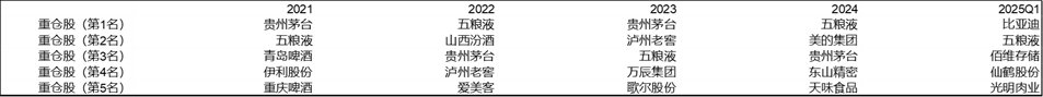 图2:2021-2025Q1中金消费升级A重仓股(中报尚未公布)