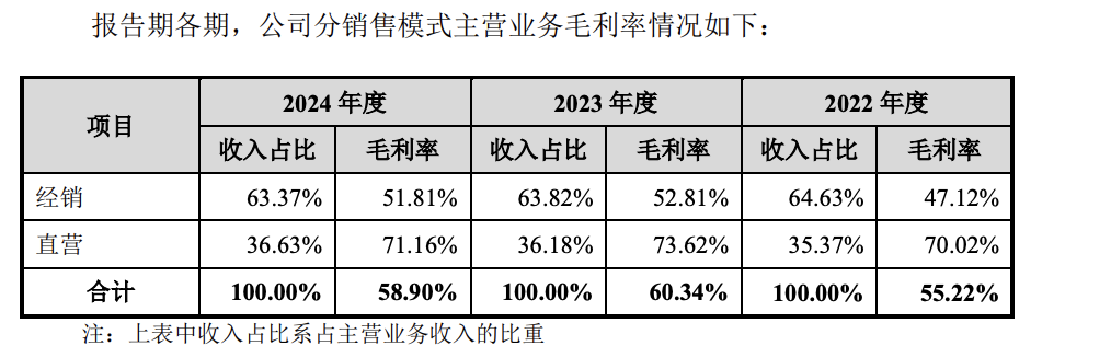 核心原因在于利润分流,招股书显示,2024年直营毛利率达71.16%,而经销毛利率仅51.81%。界面新闻此前报道,植物医生以4.3折向加盟商供货,叠加活动折扣后甚至低至3折,在经销收入占比60%的结构下,还需承担经销商返点、物流补贴等成本。