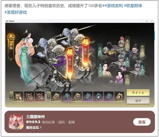 《三国望神州》凭借在美术、剧情、玩法等多方面的卓越品质,让玩家一玩就上头,甚至不少家长力荐,因为游戏剧情和玩法参考了大量史实,玩家游戏中还能增长文史知识,因此家长也不反对孩子玩这款游戏。
