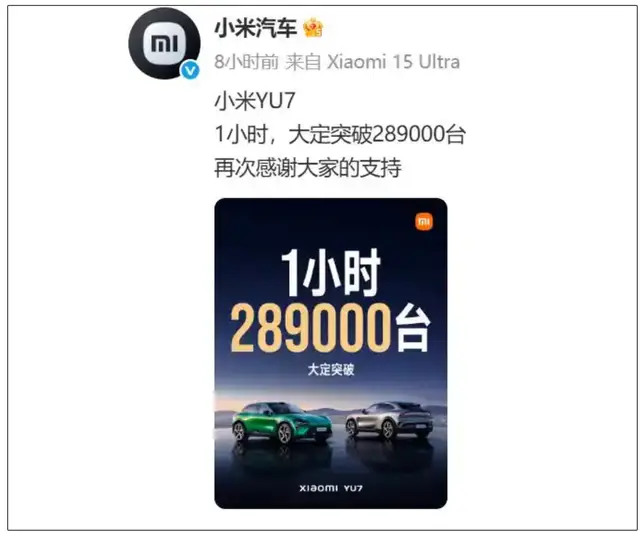1小时大定突破289000台,小米YU7发布后爆单,让雷军懵了,车圈也懵了。