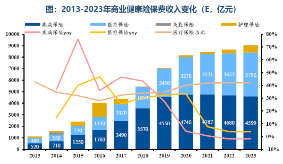 有行业专家表示,目前基本医保压力非常大,商业健康保险是降低个人支出比例的非常重要的可行路径。当下从行业角度来说,确实无论是重疾还是医疗险,某种程度上进入到平缓期,需要一些新突破。但商业健康险的潜力还在。2023年我国直接医疗支出是5.7万亿左右,目前商保赔付只有3800亿,整个占比不到7%,如果剔除重疾只看医疗险,占比只有5%,如果把大病险剔除掉,整个面向个人的商业医疗险的赔付占直接医疗险的比例只有3%。如果主要依靠商业健康险降低个人支付比例5个点,到2030年,光医疗险的体量就有两万亿,平均带来80%赔付率的话,可以带来1.6万亿的赔付,显著降低居民医疗自付的比例。