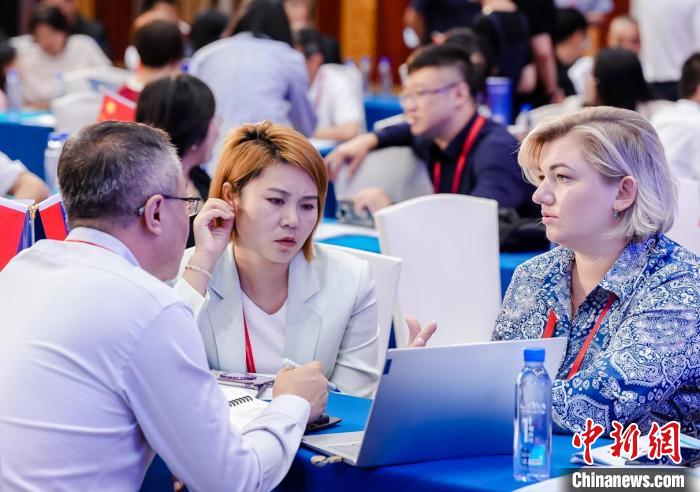 7月7日,甘肃省新能源及新能源装备进出口洽谈对接会在兰州举行。图为甘肃企业与采购企业洽谈对接。(甘肃省商务厅供图)