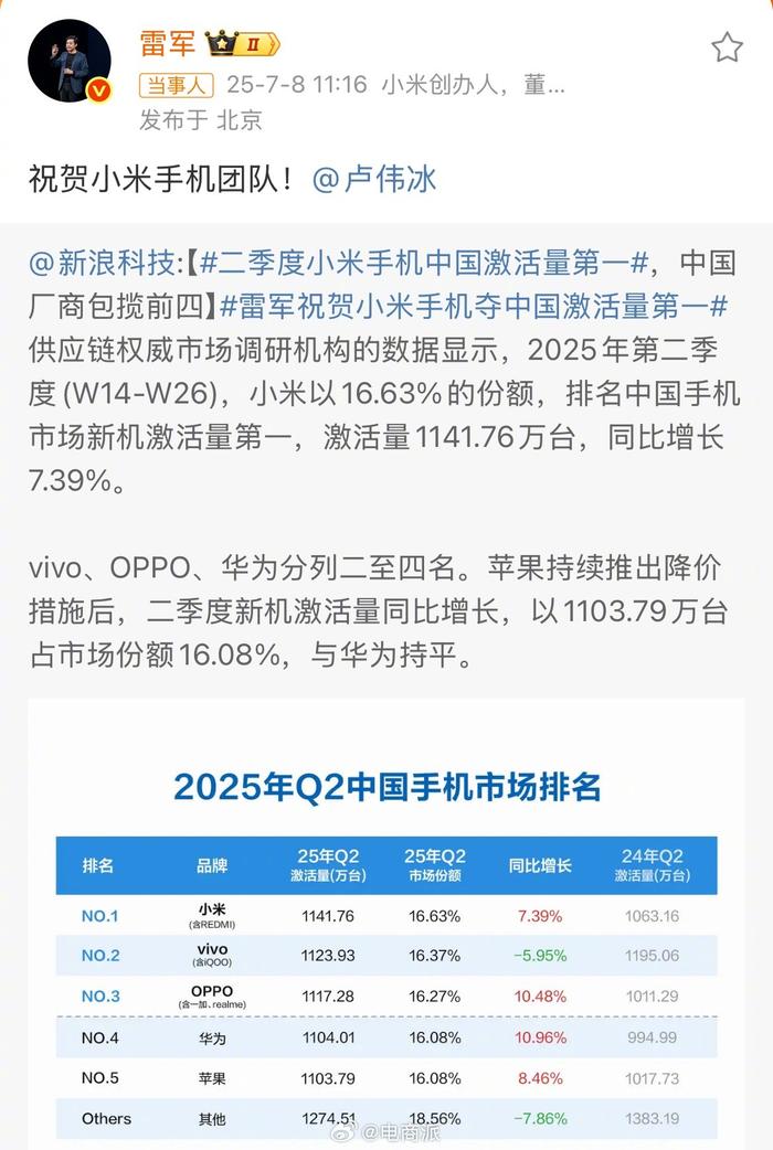 二季度小米手机中国激活量登顶,雷军发文祝贺