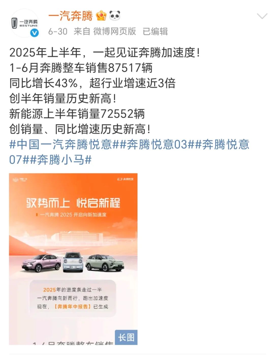 6月30日,一汽奔腾披露2025年上半年答卷——1-6月整车销售87517辆,创半年度历史峰值,且同比增速高达43%。这几乎超行业平均增速近3倍。