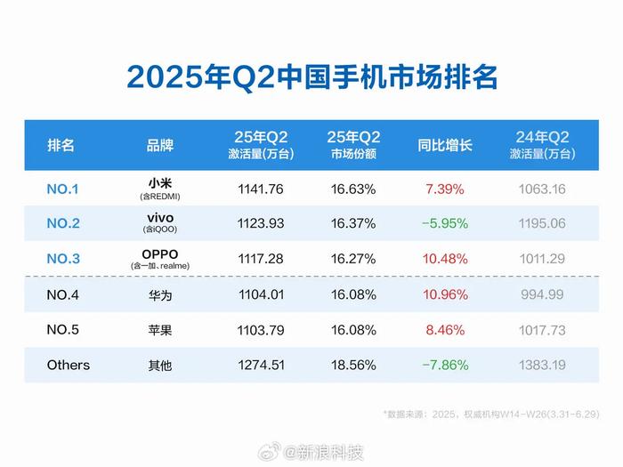 2025年Q2中国手机市场小米激活量第一、华为增速第一