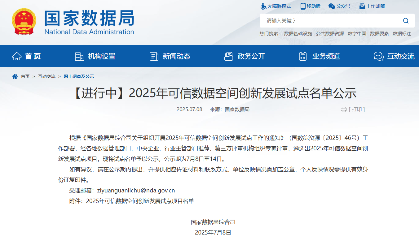 7月8日,国家数据局在官网进行试点名单公示,公示期为7月8日至14日。