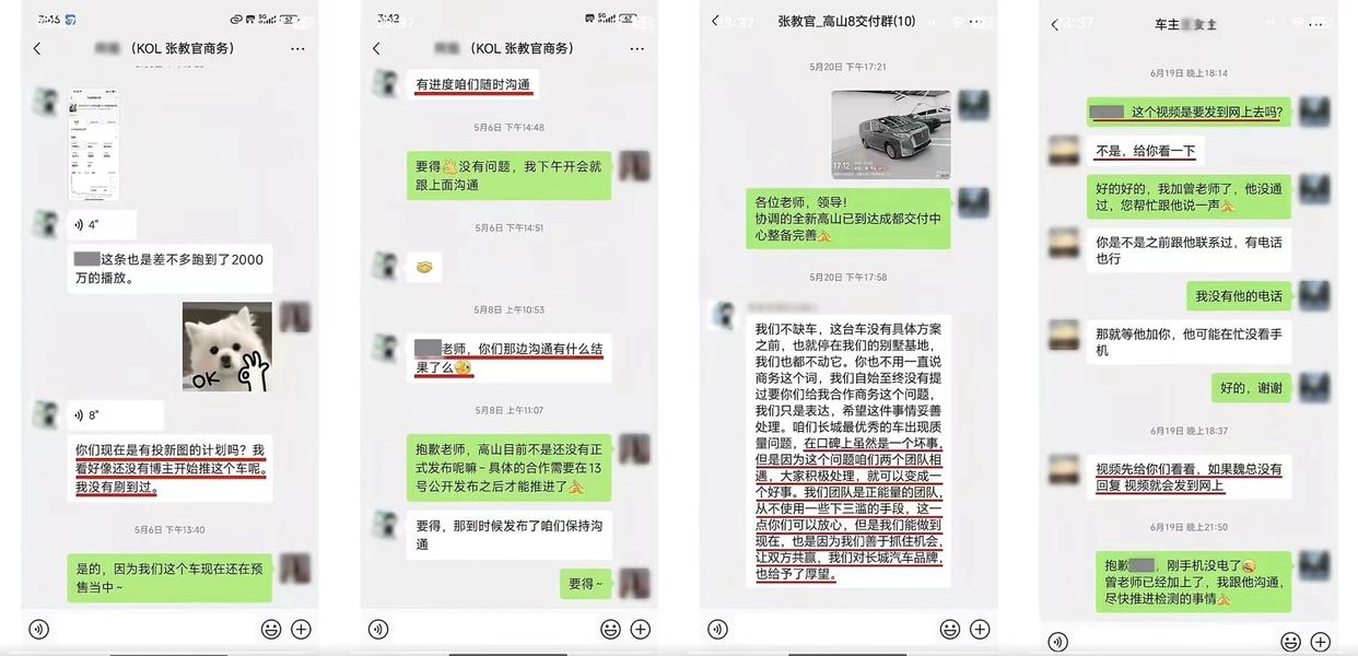 在视频最后,“一个委屈的售后店长”还放出了几张信息量巨大的聊天记录截图。截图显示,在5月6日购车前,张教官团队商务人员曾向魏牌方面展示过视频数据,并寻求商务合作,但一直未能得到魏牌方面的确认。紧接着5月16日车辆在提车当天出现故障,5月20日魏牌就已经准备了另一台新车给张教官团队,但张教官团队表示:“我们不缺车,这台车没有具体方案之前,也就停在我们的别墅基地,我们也都不动它。你也不用一直说商务这个词,我们自始至终没有提过要你们给我合作商务这个问题,我们只是表达,希望这件事情妥善处理”。