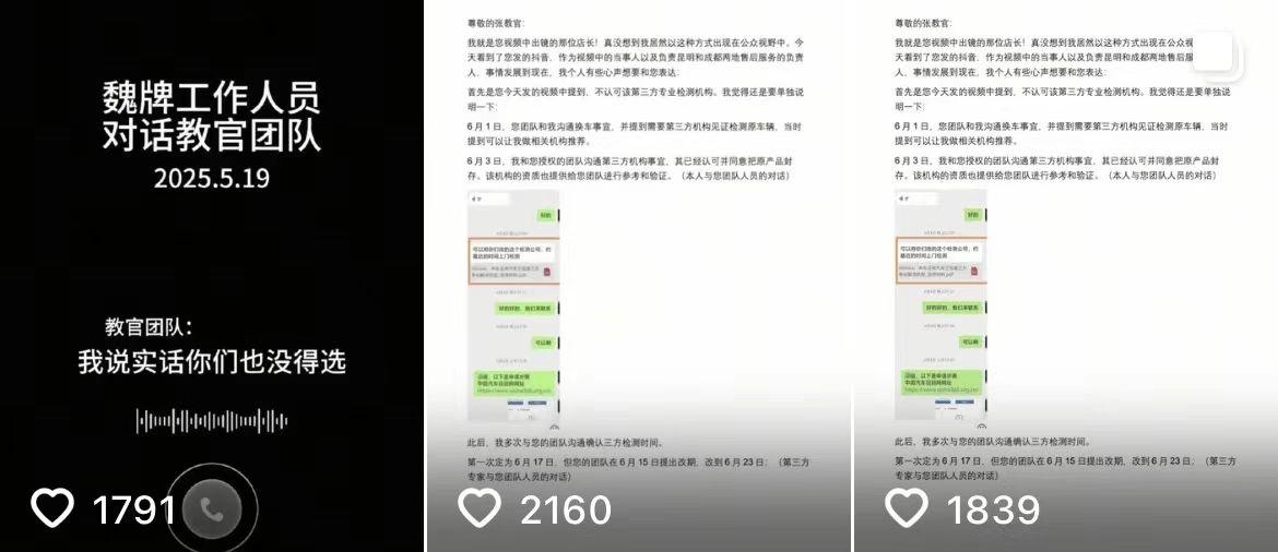 张教官团队的工作人员还表示:“咱们长城最优秀的车出现质量问题,在口碑上虽然是一个坏事,但是因为这个问题咱们两个团队相遇,大家积极处理,就可以变成一个好事”。“我们团队是正能量的团队,从不使用一些下三滥的手段,这一点你们可以放心,但是我们能做到现在,也是因为我们善于抓住机会,让双方共赢,我们对长城汽车品牌也寄予了厚望”。6月19日,张教官团队将视频发给魏牌团队,并表示:“视频先发给你们看看,如果魏总没有回复,视频就会到网上”。随后,7月2日张教官团队发布了该视频,引发了大量网友关注,给魏牌带来了巨大的舆论压力。