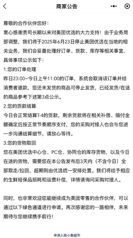 时间回到2025年6月23日,全国多地的网友发现"美团优选"小程序无法下单,系统提示为"由于业务局部调整,您所在的区域自6月23日起将暂停接单"。几乎同时,西北、华北、东北等地的团长群炸开了锅——系统后台一夜清零,履约通道全部关闭,仅广东零星城市保留服务。