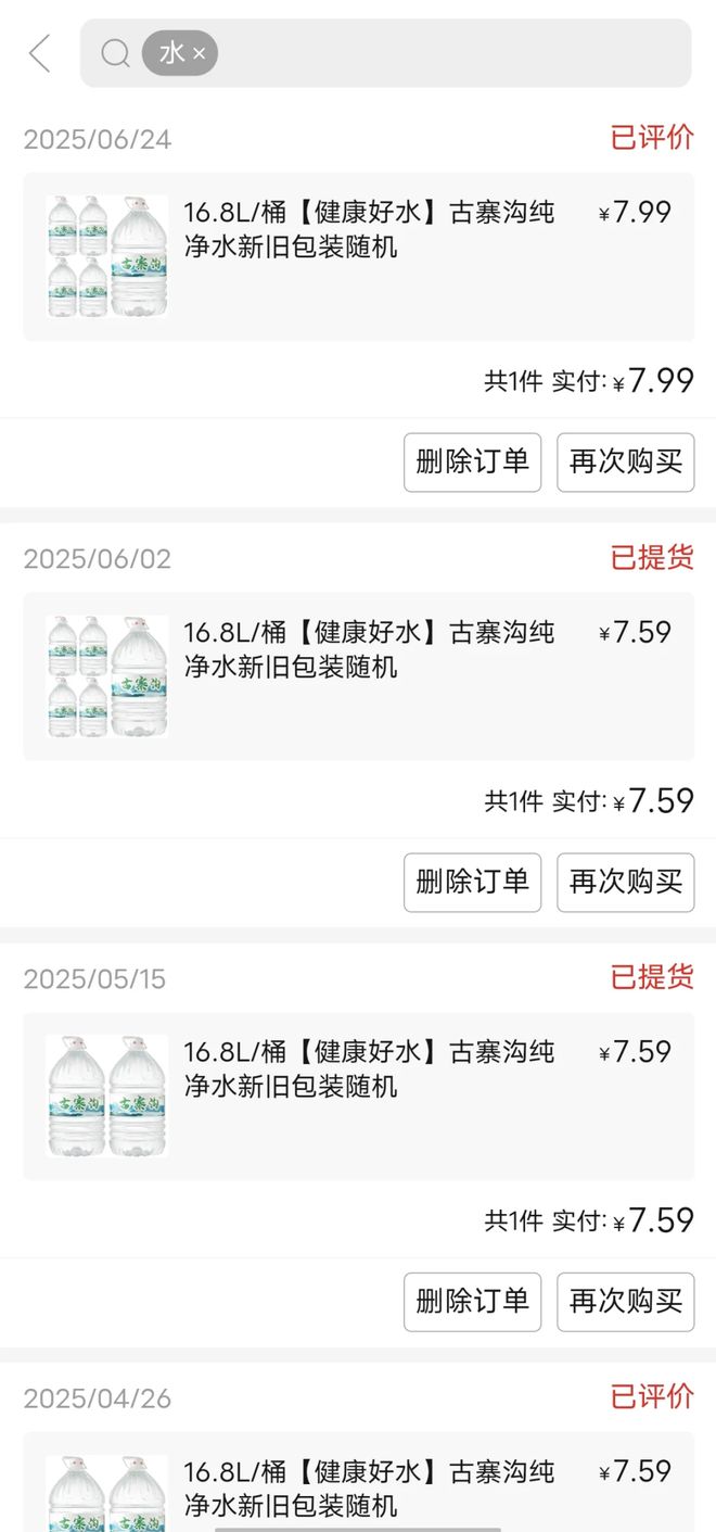 根据红星新闻报道,有网友晒出多次在多多买菜上购买古寨沟纯净水(16.8L/桶)的订单记录。从今年4月至6月,该网友多次以7.59元、7.99元的单价购买该款纯净水。