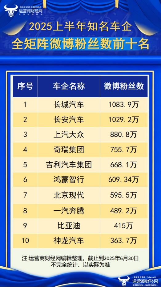 重磅!运营商财经网正式发布“2025上半年知名车企全矩阵微博粉丝数前十名”