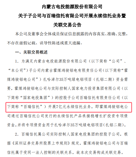 1、为满足内蒙古电投能源股份有限公司(以下简称“公司”、“本公司”)子公司内蒙古霍煤鸿骏铝电有限责任公司(以下简称“霍煤鸿骏铝电公司”)扎哈淖尔35万吨绿电铝项目(扎铝二期)资金需要,霍煤鸿骏铝电公司与实际控制人国家电力投资集团有限公司(以下简称“国家电投集团”)的控股子公司百瑞信托有限责任公司(以下简称“百瑞信托”)开展7亿元永续信托业务,即霍煤鸿骏铝电公司通过百瑞信托公司发行的永续信托产品承接稳增长扩投资专项债资金,并将专项债资金用于扎哈淖尔35万吨绿电铝项目(扎铝二期)。