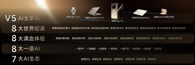 表面看,是产品力的胜利。荣耀已连续三年蝉联全球折叠屏轻薄纪录,Magic V5更是创造了折叠态8.8mm、重217g的行业新纪录,在“轻薄,长续航,精致可靠”这个不可能三角上实现了破局。但往深处看,这背后是荣耀过去三年在产品理念、智能制造、AI战略三个层面,压强式、马拉松式持续投入的必然结果。