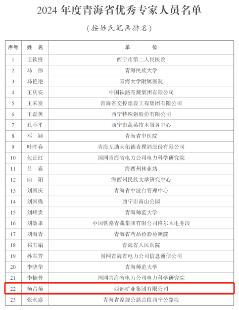 近日,青海省人民政府下发《关于授予卫钦锋等40人2024年度青海省优秀专家称号的决定》,西部矿业集团有限公司(以下简称“西部矿业”)所属西矿同鑫化工公司员工杨占菊入选。