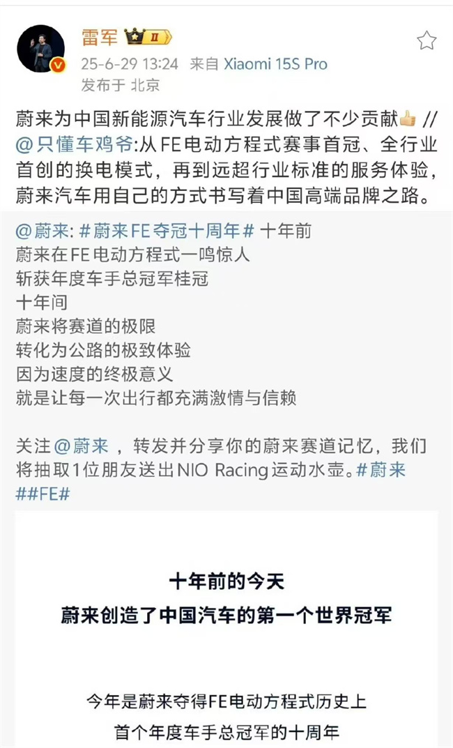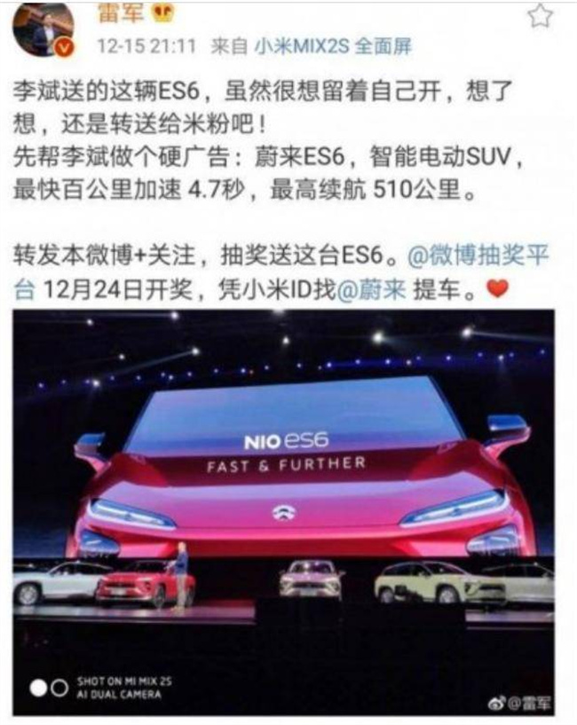 何以看出雷军的怀疑?2018年NIO Day上,雷军亮相出席,李斌相赠蔚来ES6,雷军转手通过抽奖的方式送给了米粉。彼时的雷军,即便参与了投资,也并未过多鼓吹蔚来。可见,当时的雷军对互联网造车依然保持谨慎观望的态度。