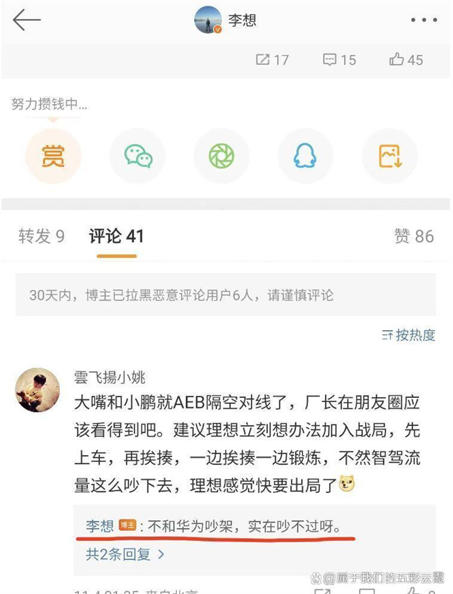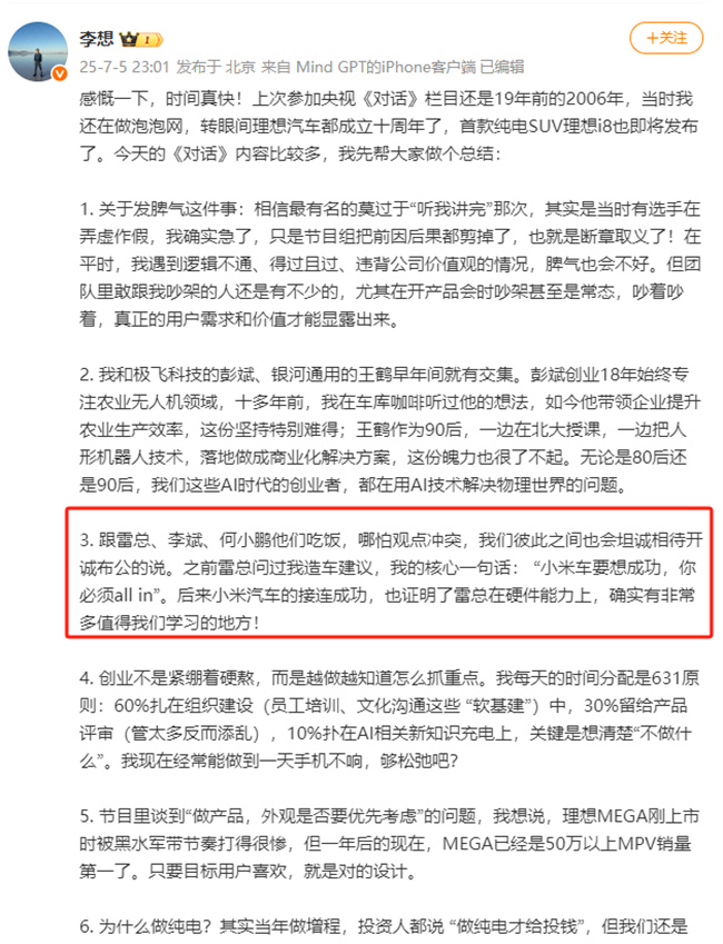 虽然当时李想微博怼人水平一流,但是在2023年11月,何小鹏、余承东因AEB隔空互喷的时候,李想选择了回避,回复网友:“不和华为吵架,实在吵不过”。从2024年开始,李想就低调了许多;近两年,他少有的几次露面,都选择了谈话类节目,容许他表达得更完整更透彻。