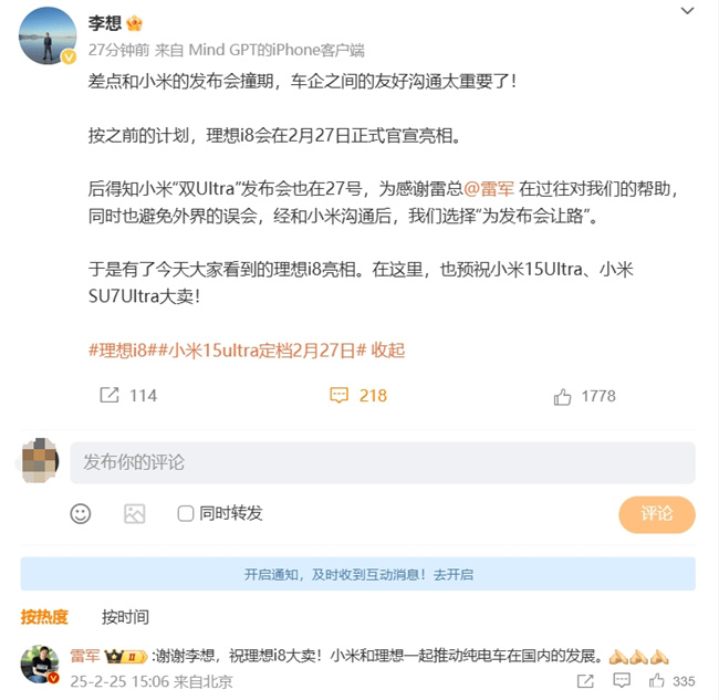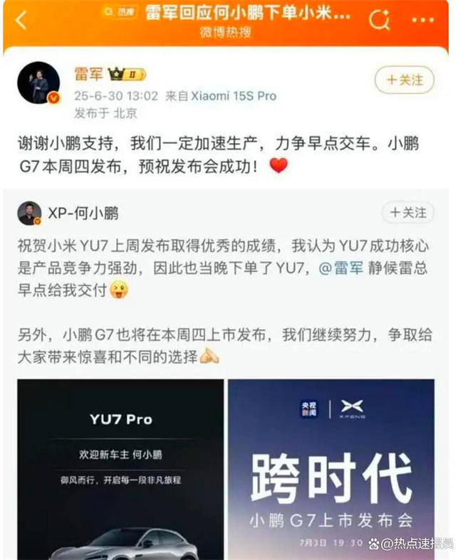 两人的亲密,也体现在最近的G7和YU7上市互撩中;雷军的回复当然也是商业互吹的教科书水准。