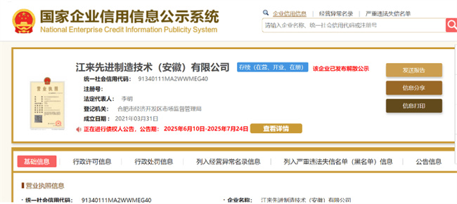 好巧不好,蔚来江淮的合资公司决议解散的新闻也在这时曝了出来——没必要恶意解读,这家名为“江来先进制造技术(安徽)有限公司”的企业,当初是方便江淮代工生产蔚来而建。随着蔚来公司拥有独立工厂并获得独立生产资质,代工关系不复存在,这家公司也就可以申请注销了。