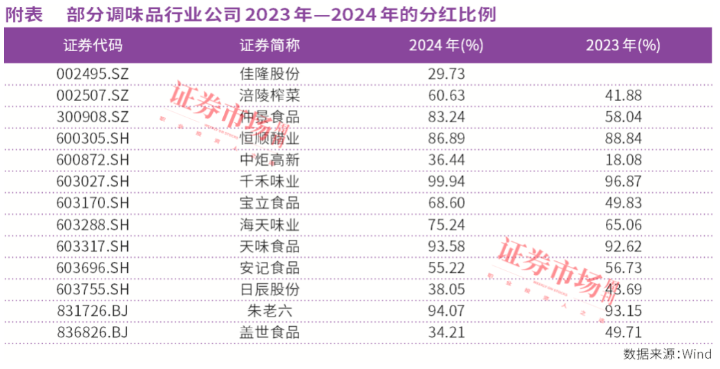 另外,在监管层的大力推动下,企业对股东回报重视度提升,近年来纷纷提升分红率,未来股息率将会是对估值支撑的重要指标。例如,恒顺醋业、千禾味业2023年至2024年的分红比例都超过80%。