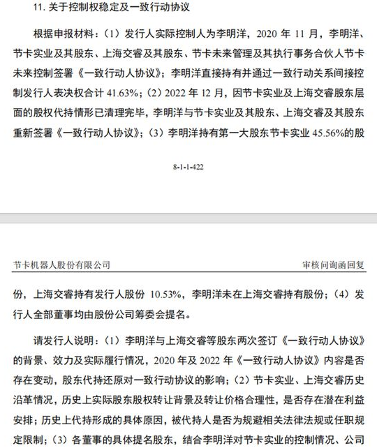 就公司股权较为分散的情况,交易所在首轮问询中要求节卡机器人结合董事提名、李明洋对节卡实业的控制、三会的运作情况等说明“实际控制人认定是否准确、是否发生变更、控制权是否稳定”。