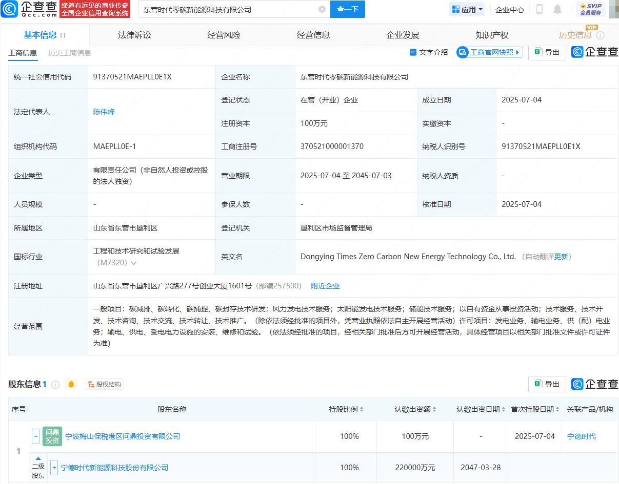 企查查APP显示,近日,东营时代零碳新能源科技有限公司成立,法定代表人为陈伟峰,注册资本为100万元,经营范围包含:碳减排、碳转化、碳捕捉、碳封存技术研发;风力发电技术服务;太阳能发电技术服务;储能技术服务等。企查查股权穿透显示,该公司由宁德时代(300750)间接全资持股。