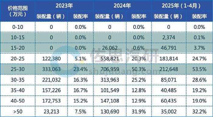 2023年中端及高端车型是L2.9 ADAS功能的重要目标市场,从装配率来看,25-30万元及30万元以上的车型装配率较高。其中,25-30万元价格区间车型L2.9装配率最高,由2023年的23.4%增长到2025年1-4月的53.5%; 50万元以上高端车型L2.9装配率增速最快,由2023年的7.5%增加到2025年1-4月的32.2%。
