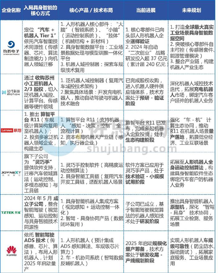 ADAS Tier 1切入具身智能新赛道的部分玩家对比