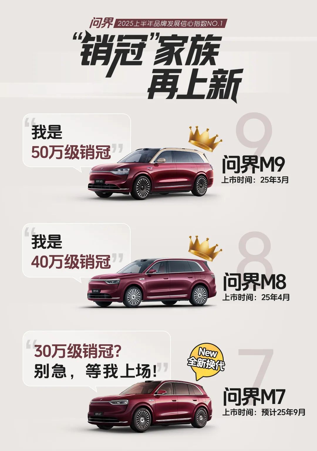 接下来,全新问界M7也将会在9月上市,新问界M7是一款从里到外的全新产品,既有增程也有纯电,此次焕新升级,除了车身颜色外,并针对辅助驾驶系统、动力平台及空间设计进行全面迭代,剑指25万级家用SUV市场。这也将进一步巩固问界M7 在30万级销冠地位。