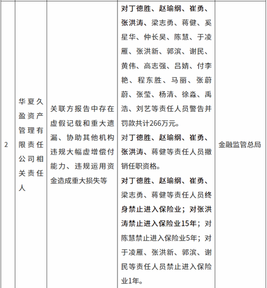 罚单对丁德胜、赵瑜纲、崔勇、梁志勇、蒋健等责任人员终身禁业;对张洪涛禁业15年;对陈慧禁业5年;对于凌雁、张洪新、郭滨、谢民等责任人员禁业1年。其中,丁德胜曾任华夏久盈资管董事长,赵瑜纲曾任华夏久盈资管总经理,其余被罚责任人分别曾任华夏久盈资管投资、董办、合规等重要岗位负责人。