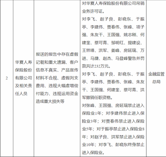 近日,金融监管总局处罚,华夏人寿及23名相关责任人因报送的报告中存在虚假记载和重大遗漏等多条违法违规行为,被警告并罚款共232万元。其中,12人被撤销任职资格,8人被禁业。