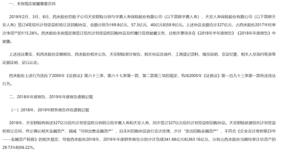 值得一提的是,上述天安财险、天安人寿、华夏人寿3家“明天系”险企部分具体违规行为早已在“西水股份违规案”中有所披露,已退市的西水股份系天安财险母公司。2024年8月,中国证监会内蒙古监管局公布的行政处罚决定书显示,西水股份涉及多项违法违规行为,其中问题主要与天安财险同华夏人寿、天安人寿签订的4笔信托计划受益权转让及回购协议有关。