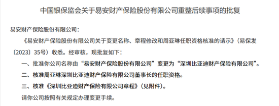 直至2023年5月9日,比亚迪汽车工业有限公司(以下简称“比亚迪”)受让易安财险10亿股股份,持股比例为100%。2023年5月17日,易安财险更名为比亚迪财险。