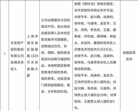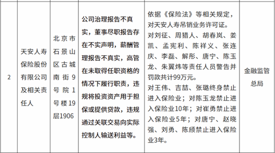 今年6月13日,金融监管总局行政处罚信息公示列表显示,天安人寿及相关责任人因公司治理报告不真实,董事尽职报告存在不实声明,薪酬管理报告不真实,高管在未取得任职资格的情况下履行职责,违规将投资资产用于担保或提供贷款,违规通过关联交易向实际控制人输送利益等,被吊销业务许可证。