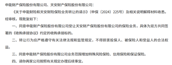 此后,2024年8月28日,金融监管总局批准由申能财险受让天安财险全部保险业务。2024年10月1日,申能财险完成对天安财险保险资产的受让,包括但不限于保单赔案、信息系统、员工队伍、机构网点等,同时继承、延续了既往的承保、理赔与服务经验。