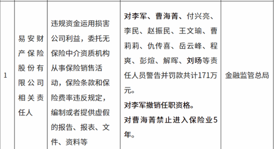 其中,被撤销任职资格的李军曾任易安财险董事长,被禁业的曹海菁曾任易安财险总经理,其余被罚责任人分别曾任易安财险合规、精算、财务等重要岗位负责人。